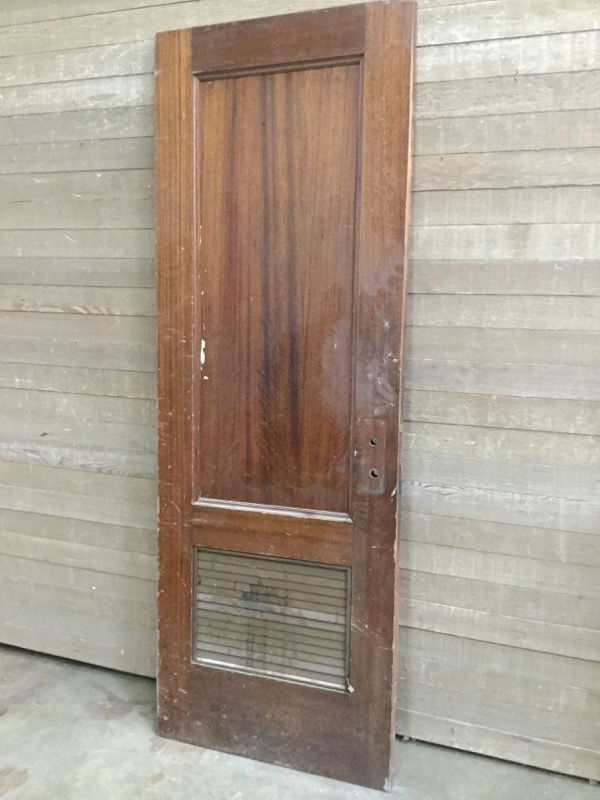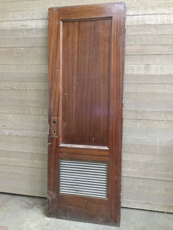 Vintage, stained mahogany two panel door with a sticky but operable louvered vent as the bottom panel. This came to us as surplus materials from the old seminary building at St. Edward State Park in Kenmore.