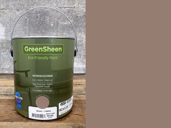 One gallon of Brown GreenSheen house paint. GreenSheen paints are made from 100% reclaimed materials. They process the paint that Washington residents recycle with the PaintCare program! GreenSheen is a quality eggshell finish paint that is available in a wide range of colors and costs much less than traditional paints. Their reclamation and cleaning process produces an interior/exterior house paint that is naturally lower in VOCs and provides exceptional coverage and durability. Check out our full selection of 18 different colors, available in one or five gallon sizes. Learn more about GreenSheen here. Please note, this is a bulk item and cannot be placed on hold.