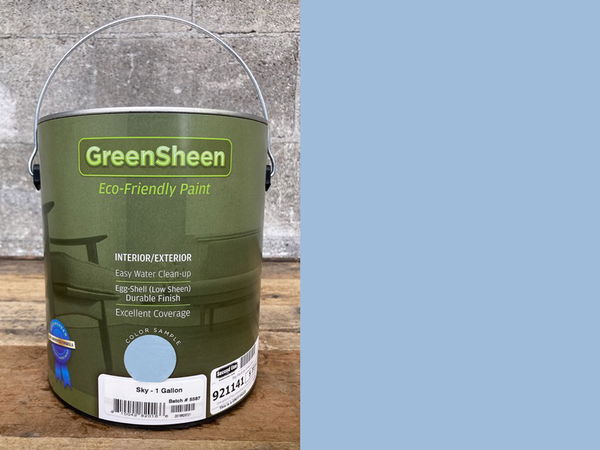 One gallon of Sky GreenSheen house paint. GreenSheen paints are made from 100% reclaimed materials. They process the paint that Washington residents recycle with the PaintCare program! GreenSheen is a quality eggshell finish paint that is available in a wide range of colors and costs much less than traditional paints. Their reclamation and cleaning process produces an interior/exterior house paint that is naturally lower in VOCs and provides exceptional coverage and durability. Check out our full selection of 18 different colors. Learn more about GreenSheen here. Please note, this is a bulk item and cannot be placed on hold.