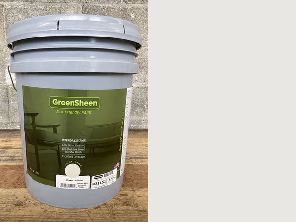 Five gallons of Cream GreenSheen house paint. GreenSheen paints are made from 100% reclaimed materials. They process the paint that Washington residents recycle with the PaintCare program! GreenSheen is a quality eggshell finish paint that is available in a wide range of colors and costs much less than traditional paints. Their reclamation and cleaning process produces an interior/exterior house paint that is naturally lower in VOCs and provides exceptional coverage and durability. Check out our full selection of 18 different colors, available in one or five gallon sizes. Learn more about GreenSheen here. Please note, this is a bulk item and cannot be placed on hold.