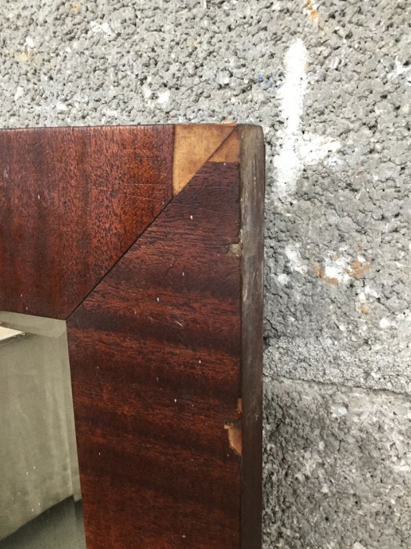 Vintage wall hanging mirror with beveled glass and a wood frame with a tropical hardwood veneer. Veneer is chipped on one one corner but she's still a stunner.