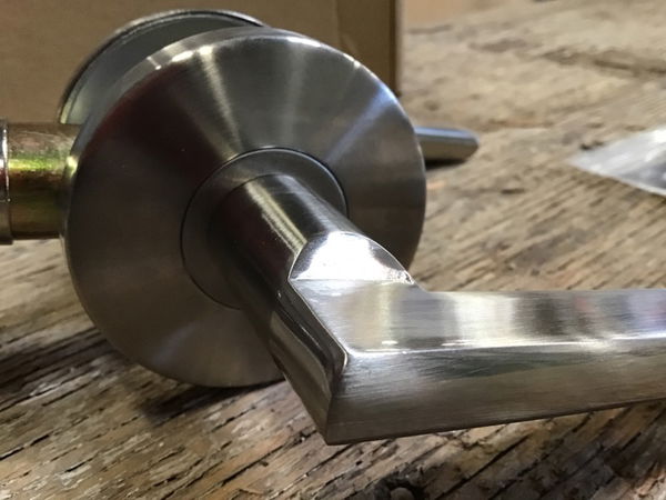 Sleek modern lever set (passage), brushed nickel finish; contractor surplus, new in box, all wrapped up. Left or right hand swing // reversible. No brand name to be found, but they seem to be nice quality - have some heft to them and the finish looks good. This is a bulk item and cannot be placed on hold -- come down to the shop to get yours!