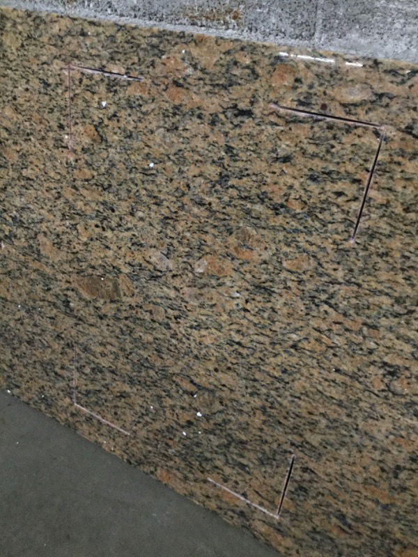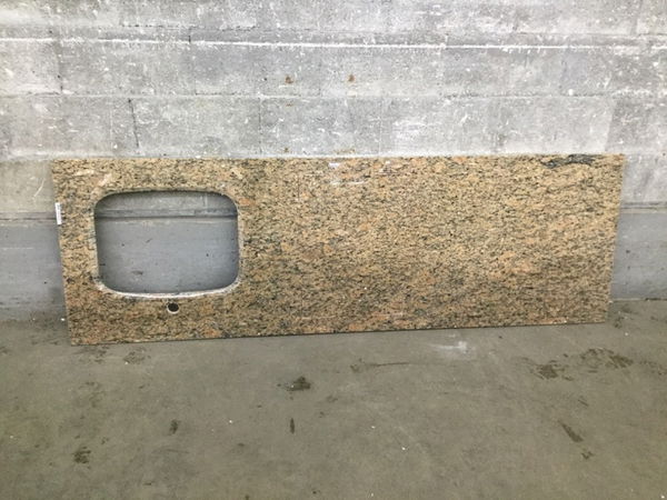 Rosy and black swirled granite countertop with a bullnose front edge and 18.25" x 14" sink cutout with one faucet hole. The corners of a rectangle have been cut pretty much smack in the center of this slab. I'm not sure what they were intended for, but you could work around them by cutting this into two pieces - a 30.75" long sink countertop and 30.5" long piece. Price reflects oddness.