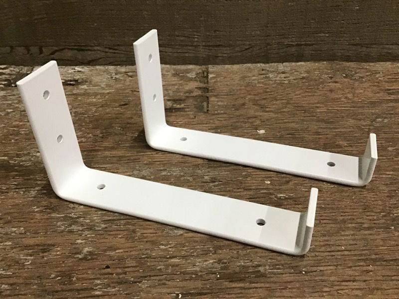 Pair of custom bent steel shelf brackets, fabricated by a local family operation, comes in a white powdercoated finish. Bent 3/16" steel with lip. Width allows for a 7.50" board.