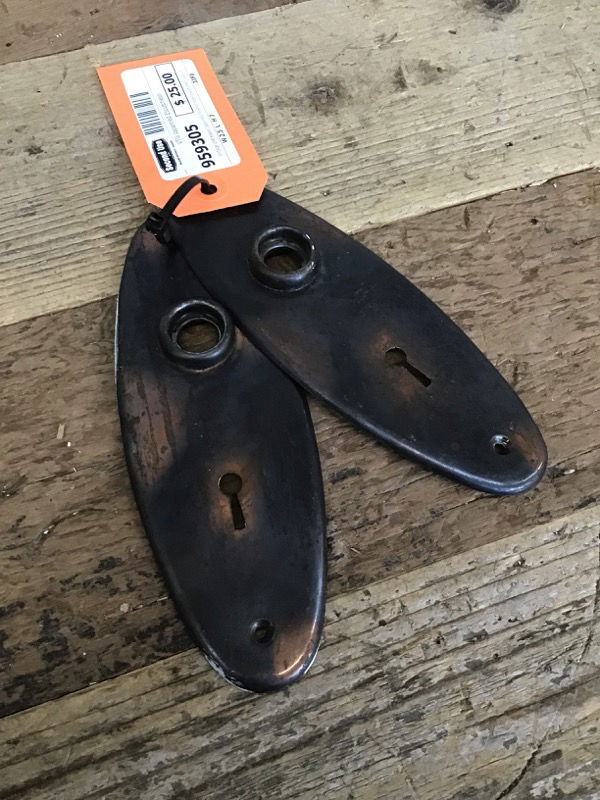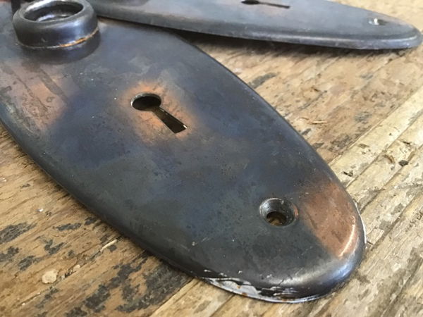 Vintage Japanned finished steel escutcheon pair. Has a distressed oxidized bronze appeal.