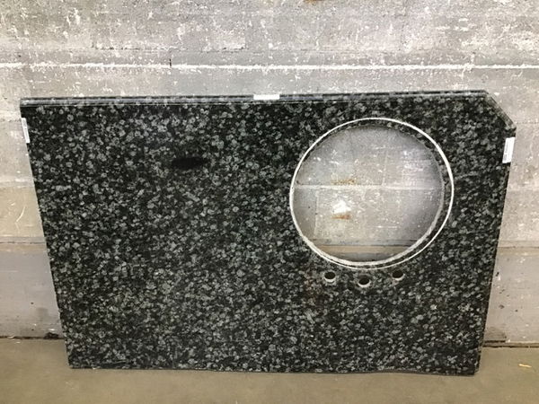 This granite countertop features gray, blue and black hues. The front and left side are finished with a bullnose edge. An~16.75" diameter circle was cut for a drop-in sink. Three faucet holes were cut above that, measuring 4" between centers. Some caulking remnants from previous installation.