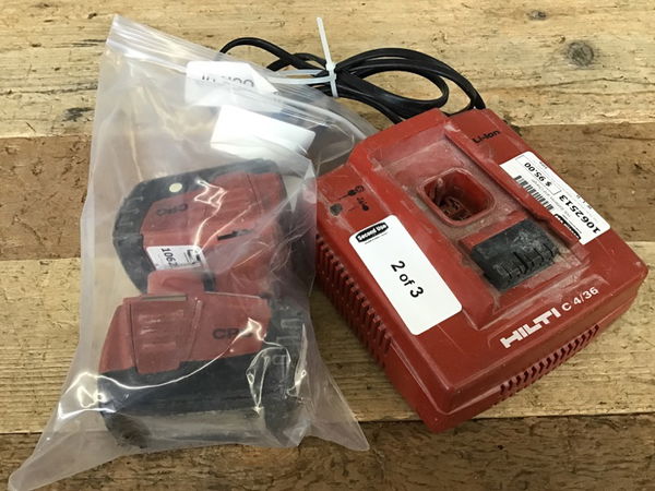 Two 14.4v Lithium ion batteries from Hilti. Comes with the C 4/36 charger. Both batteries appeared to be charged, based on their indicator lights.