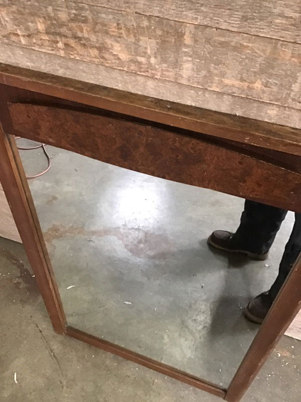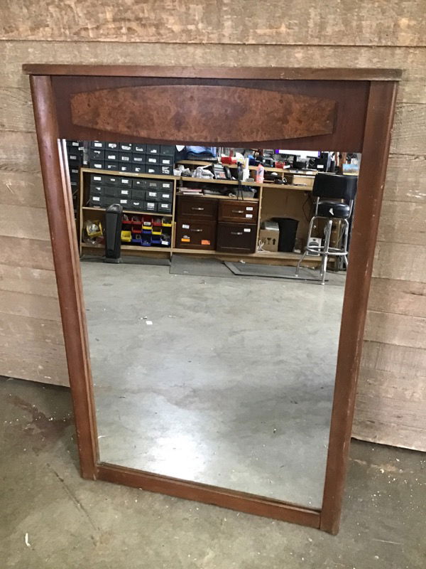 MCM rectangular mirror with burled Walnut veneered accent. Sides have a carved shape to them. Was once a part of a vanity set, so there is no hanging twine yet, an easy addition to install if that is what you desire. Beautiful dark stain and unique frame. Perfect size for any room.