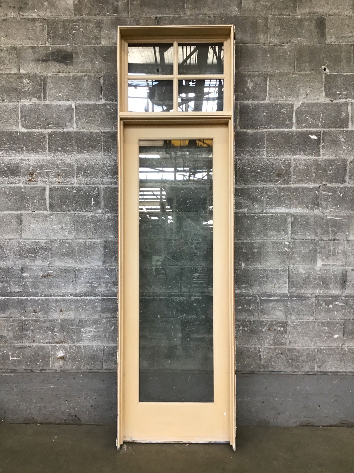 This extra-tall sidelite offers one large pane of thermopane glass, as well as an inoperable transom window with true-divide thermopane glass. The interior is finish beige; the exterior is finished brown. Some scratches and dings from previous use.