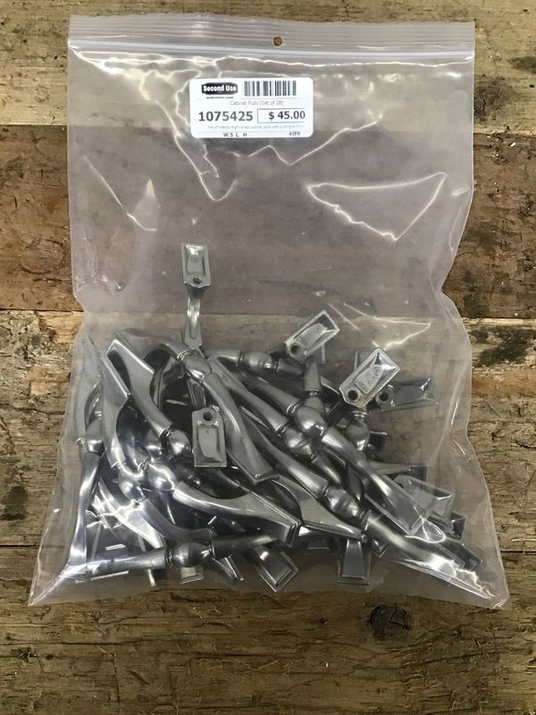 Set of twenty-eight brass cabinet pulls with a chrome finish. Screw holes are 3" apart.