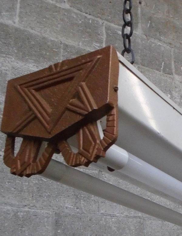 Really cool, rare vintage Deco light fixture from the early days of fluorescent lighting! We restored and rewired this beauty in our in-house lighting workshop upstairs. In the process, it was converted from taking fluorescent bulbs to the more common, 4' LED bulbs. Some scratching is present on the enamel, and this has been reflected in the price. Similar style Deco fixtures go for upwards of $1,300 elsewhere online.