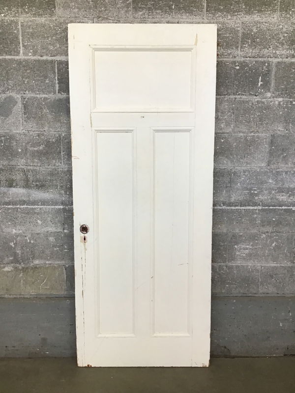 This vintage three panel interior door features two vertical panels below one wide recessed panel. There is a crack in one panel and in the latch side rail, price reflects.