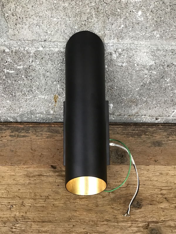 A sleek black wall sconce with gilded interior, the Tourain wall light from Aerin. Retails new for $600. This piece has a bent mounting bracket that will need to be replaced in order to mount flush.