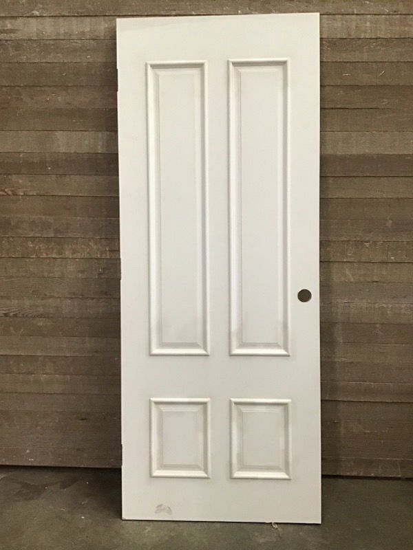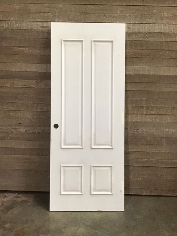 4 panel door with masonite skin. Raised panels with molding, Victorian style. Drilled for a cylinder latch set.