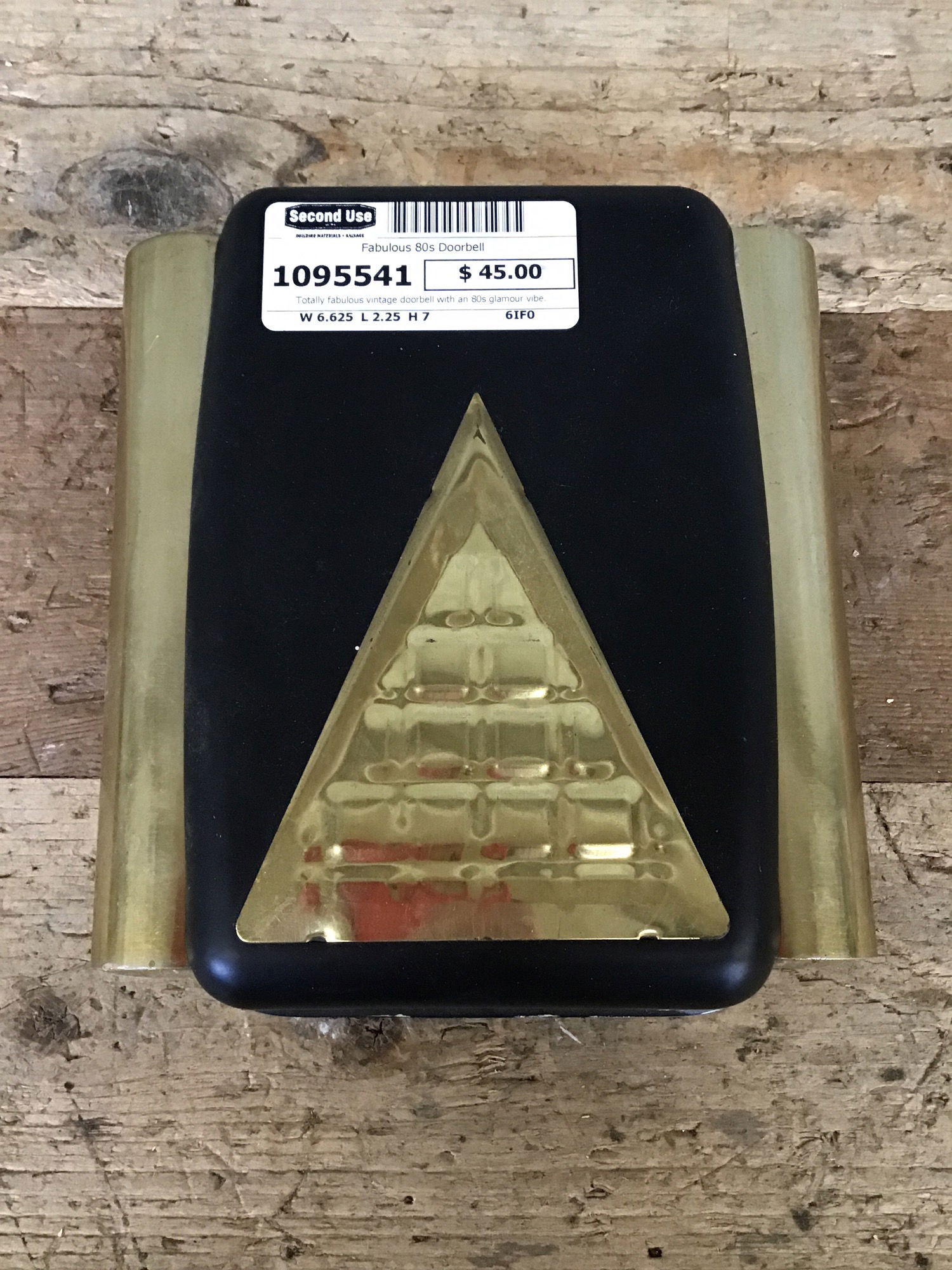 Totally fabulous vintage doorbell with an 80s glamour vibe. Two brass bells flank the matte black cover, adorned with a quilted, triangular brass plate. This thing is rad.