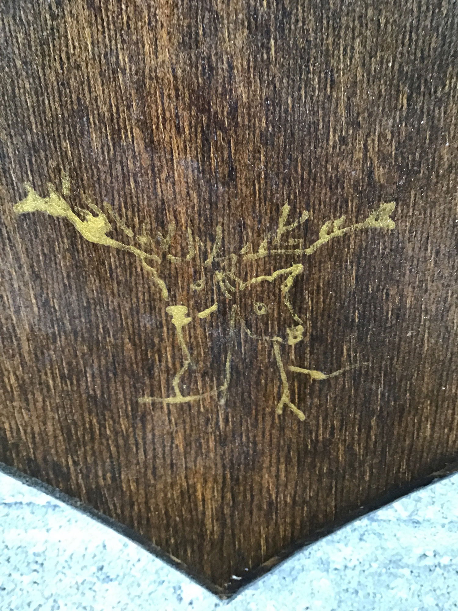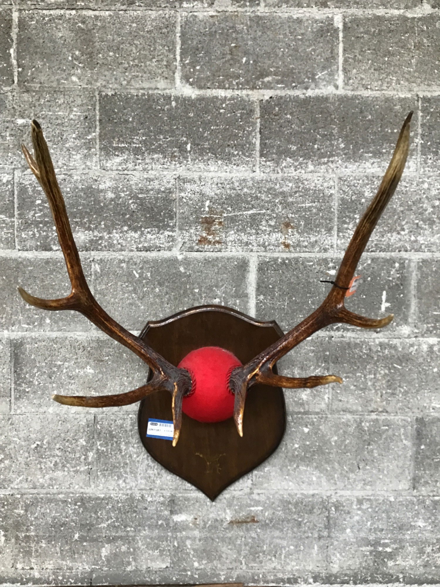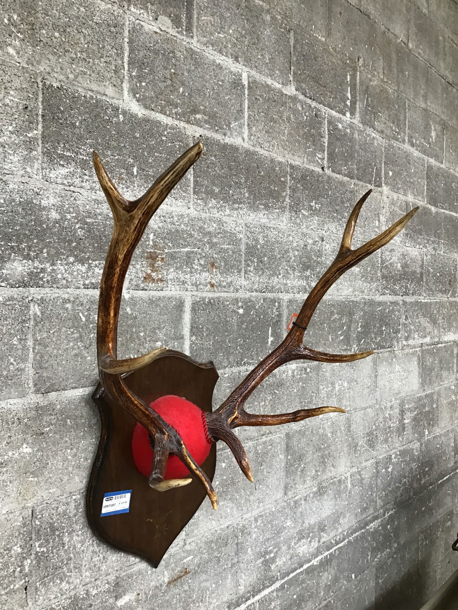 Nice looking set of 5x5 elk antlers mounted on a dark stained wood shield with a red felt covering.