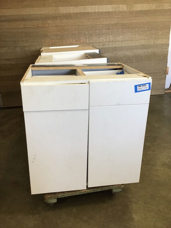 Base cabinet with 2 drawers and 2 doors. Particle board box. In good condition, with some damage from transport. No pull hardware installed. New/never used.