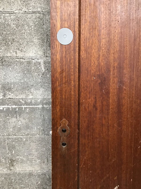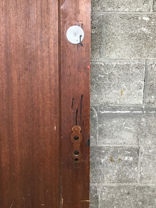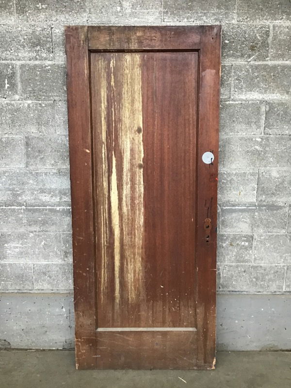 Exterior thickness mahogany single panel door in a dark stain. This is bored for vintage hardware and has the wear and tear you'd expect from a door with an "Employees Only" sign. Still a solid door well worth the effort to clean it up!