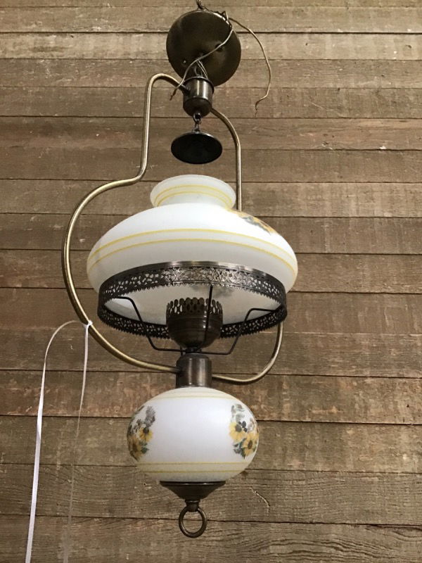 Victorian style oil lamp with single bulb. Features brushed brass frame, and white glass shades decorated with sunflowers and sparkly yellow lines. In nice condition; all ready to be wired up!