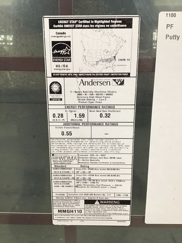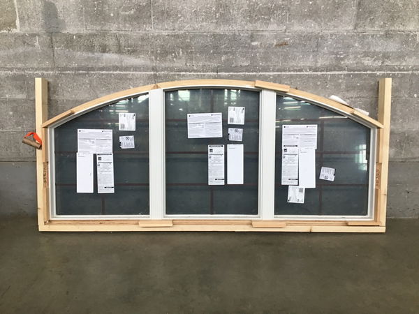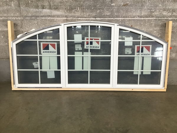 Ca. 2022 Andersen white aluminum clad exterior, factory primed pine interior, arch top, fixed window with faux divided lite grids, which are white on the outside and brownish bronze color on the inside. Has energy tag attached. Short sides are 24 5/8" from bottom.