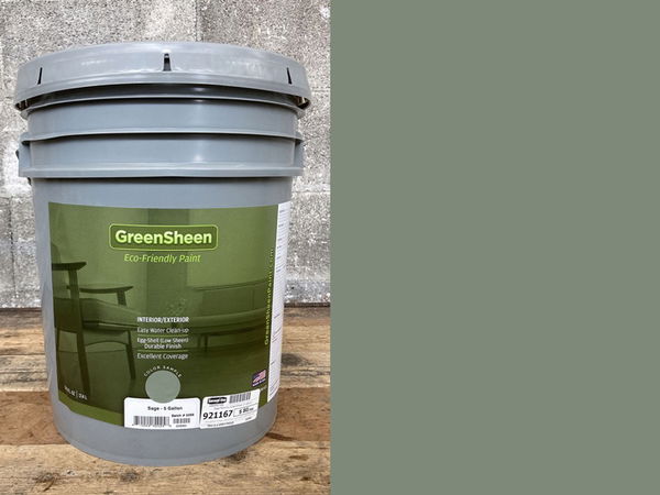 Five gallons of Sage GreenSheen house paint. GreenSheen paints are made from 100% reclaimed materials. They process the paint that Washington residents recycle with the PaintCare program! GreenSheen is a quality eggshell finish paint that is available in a wide range of colors and costs much less than traditional paints. Their reclamation and cleaning process produces an interior/exterior house paint that is naturally lower in VOCs and provides exceptional coverage and durability. Check out our full selection of 18 different colors, available in one or five gallon sizes. Learn more about GreenSheen here. Please note, this is a bulk item and cannot be placed on hold.