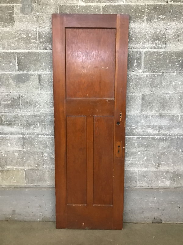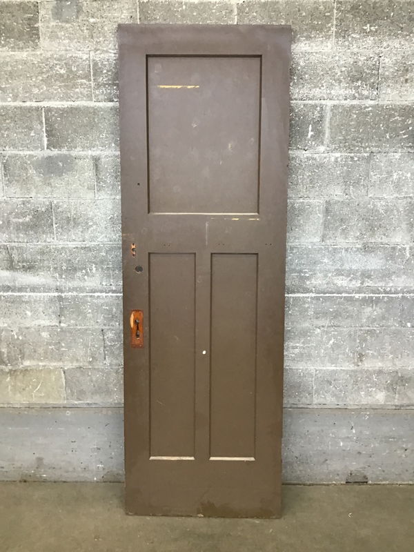 Solid wood construction three panel door that came to us from a Catholic school on Capitol Hill. One side is painted brown and the other features gorgeous clear grain on the rails & stiles with face grain on the panels. Drilled for mortise cassette and deadbolt.