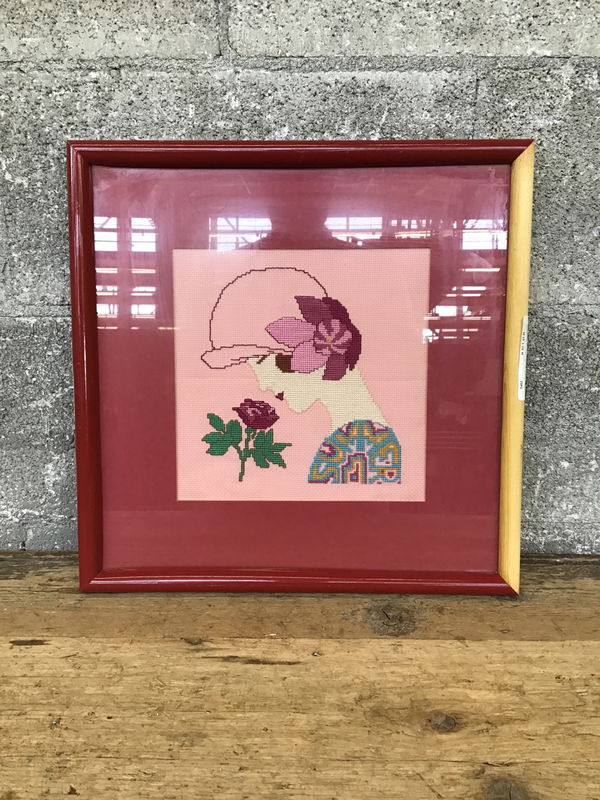 Needlepoint depicting a fancy deco lady admiring a flower. One side of the laminate frame is missing the mauve laminate.