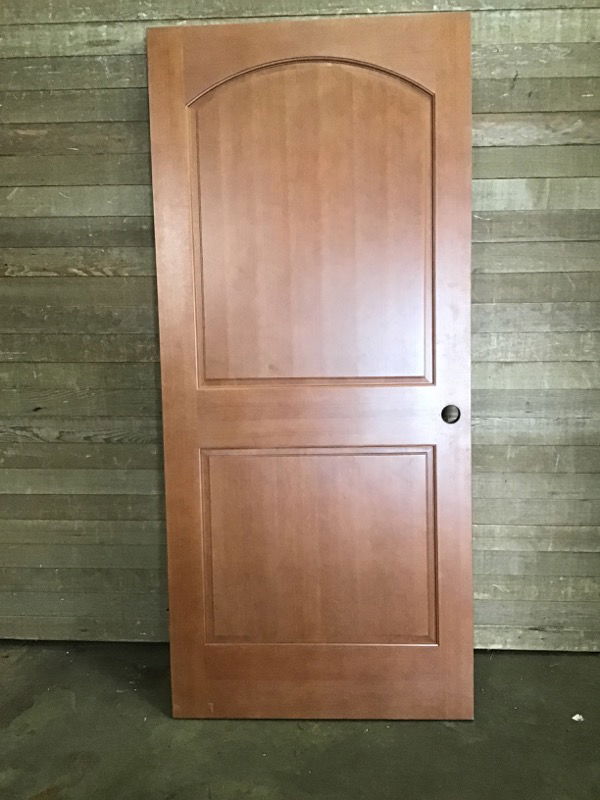 New two panel interior door in great shape, bored for modern hardware. Nice dark stained clear vertical grain Fir.