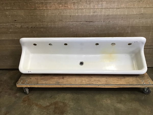 Wall mount enameled cast iron trough sink salvaged from a local school. Though this sink wall mounts it will still need support legs for safe installation. Sink has holes for two faucets and a single center drain. Wouldn't this be incredible installed in a garden?