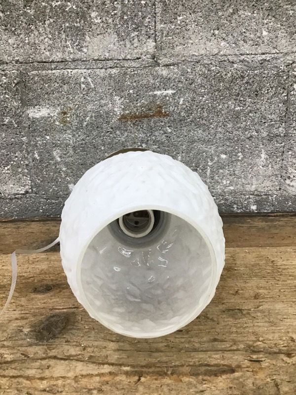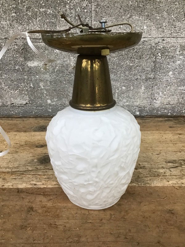 There's some surface rust on the brass finished fitter of this John C. Virden Co. semi-flush mount light, but it has a cool, mottled white shade. Wiring is older, but still looks o.k.