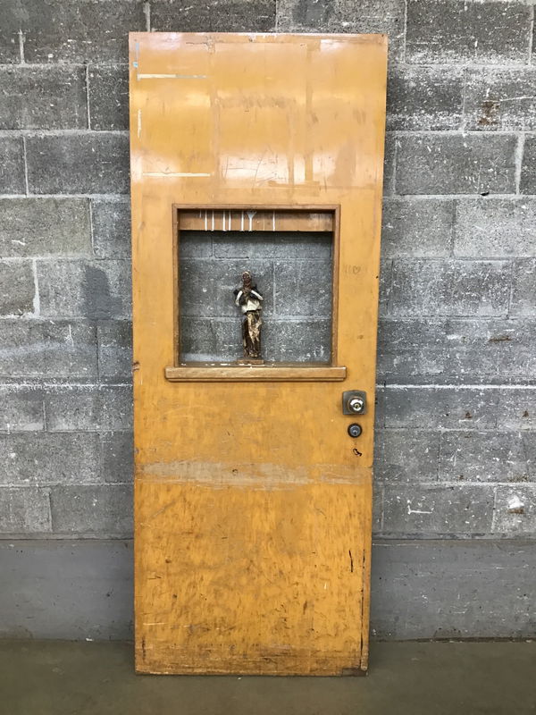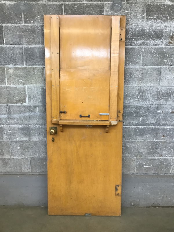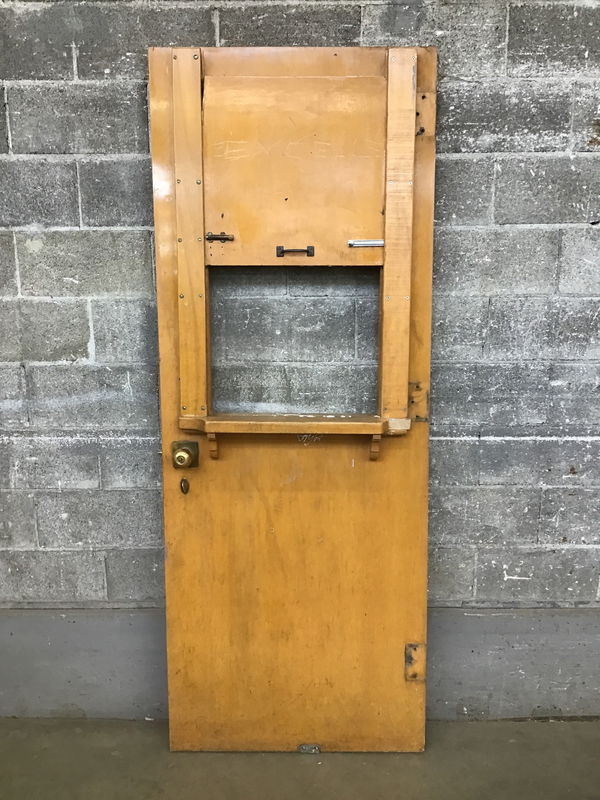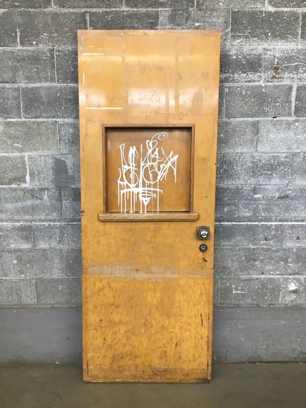 Solid core interior door with exterior door thickness that was salvaged from a local school. I'm assuming it was in a Cashier's office or Library as it has an opening in the middle with a sliding wooden window that you can slam shut in someone's face when you have had enough of their BS. Plenty of wear from its previous life, including scratches and graffiti.