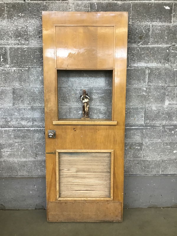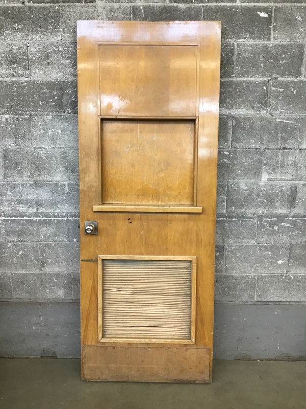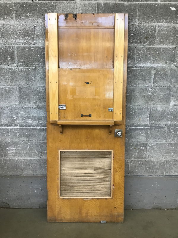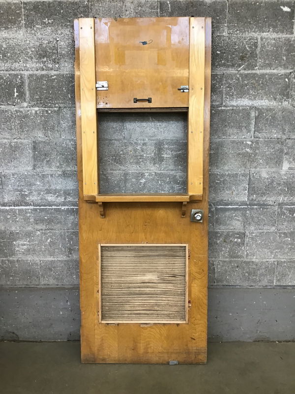 Vented solid core interior door with exterior door thickness that was salvaged from a local school. I'm assuming it was in a Cashier's office or Library as it has an opening in the middle with a sliding wooden window that you can slam shut in someone's face when you have had enough of their BS. Plenty of wear from its previous life, including scratches and graffiti.