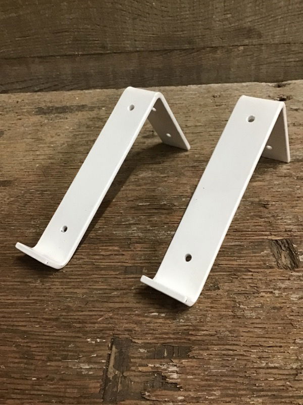 Pair of bent 1/4" steel shelf brackets with a white powdercoat. Fabricated by a local family-run operation. Brackets made to hold a board <7" wide, has a 1" lip.