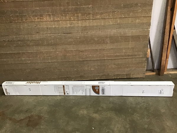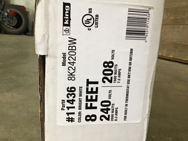 New-in-box 2022 8' King electric baseboard heater, white steel. Wires from either end, rounded corners, quiet and direct heat. Exact model retails for $261.99.