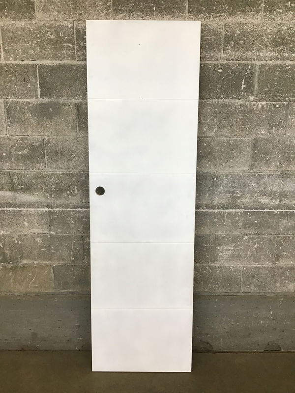 This door has 5 faux panels in a kind of modern style, like those new condos that pop up everywhere. It's got some scuffs and marks, but it's only been primed and is as of yet unpainted, none of the marks have grooves by the looks of it.