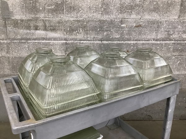 Beautiful textured glass Holophane industrial shade takes a 4" fitter. Visually stunning and in real clean shape! This is a bulk item, no holds please. Some shades may have small chips around the fitter rim that will not be visible once installed.