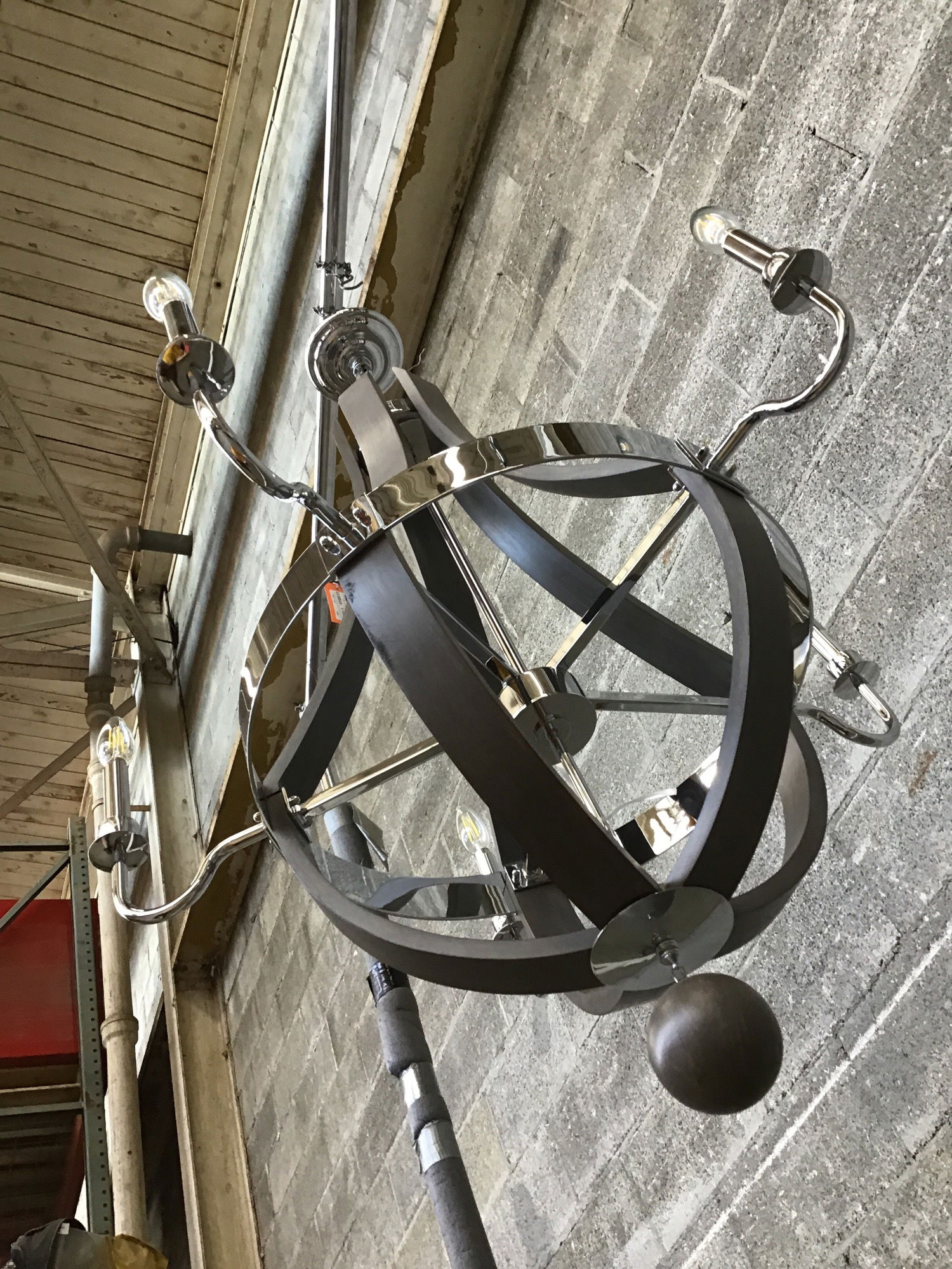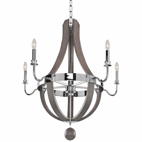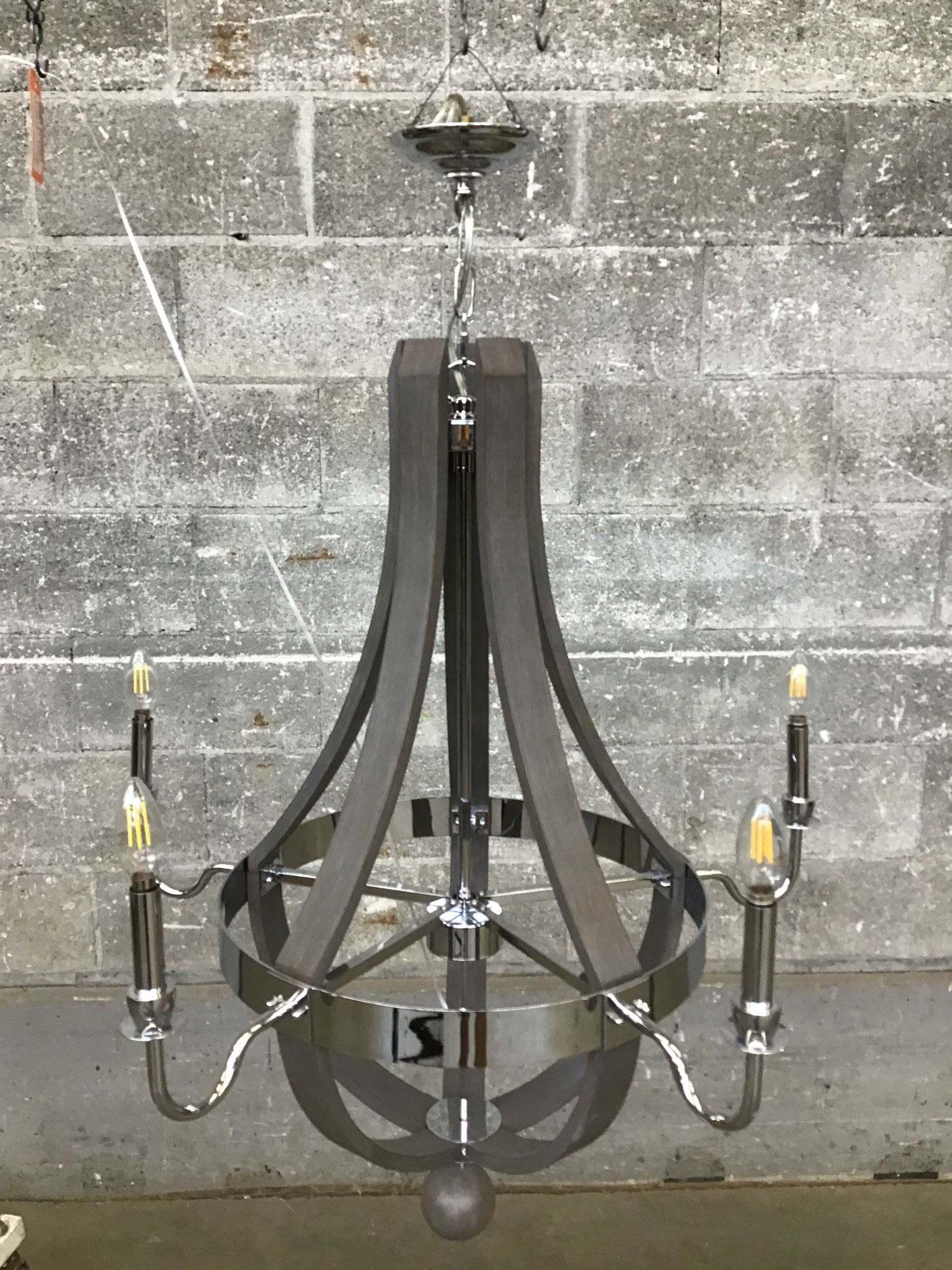 This grand chandelier features a chrome body and arms, swooping charcoal-finished, supports and five candle-sleeved light sockets. Some subtle wear. Retails at $1,300+.