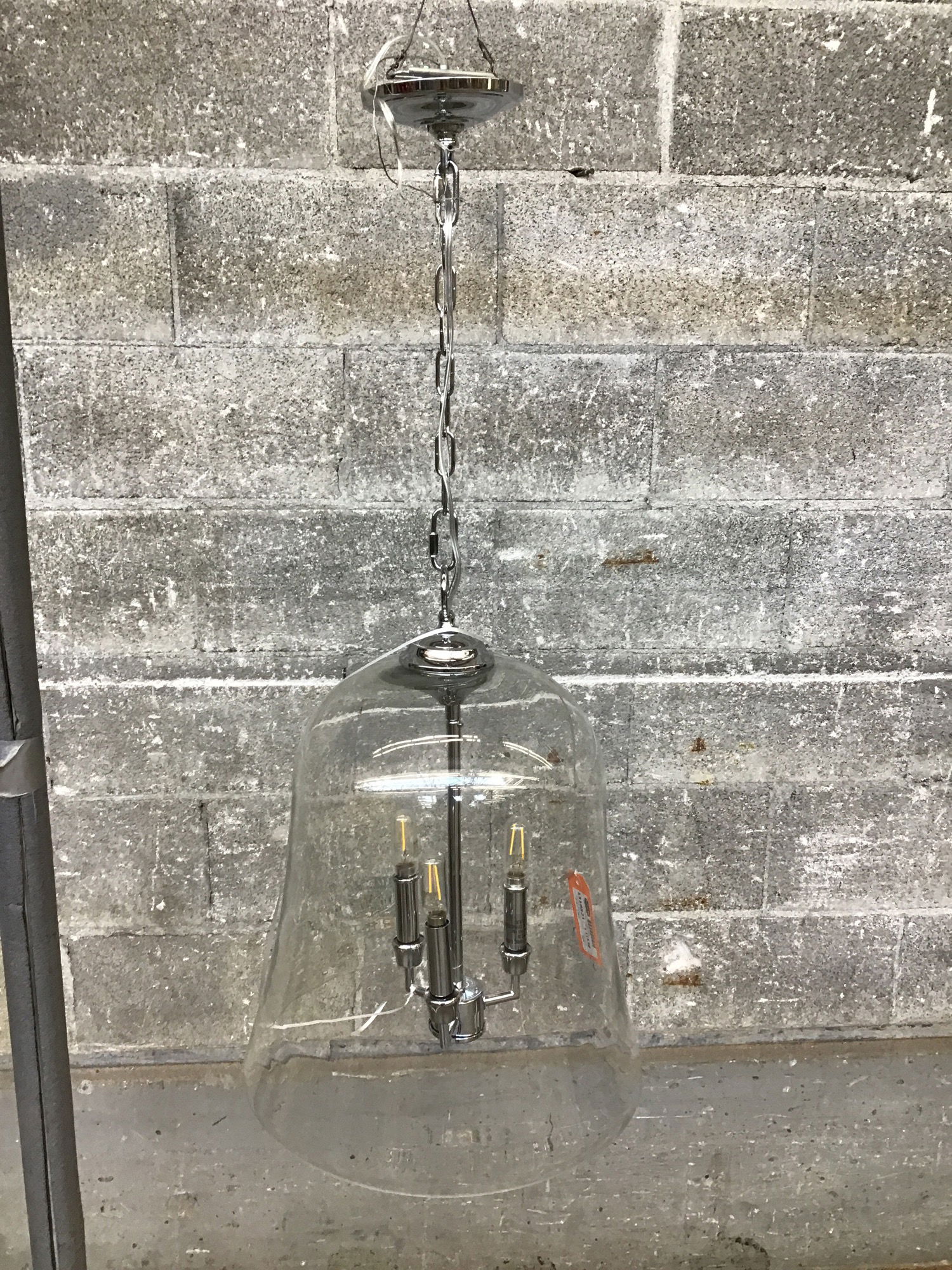 This pendant light offers a minimal design, centered with a chrome canopy and tube and softened by bell-shaped glass shade. This light includes three chrome candle-sleeved light sockets. Limited signs of wear. Retails at $395+.