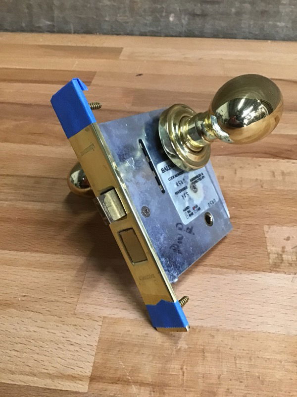 Left hand, reversible brass Baldwin privacy mortise. Comes with Baldwin knob set but you will have to get the hardware for the lock mechanism. 2 1/2 in. backset. This is a fancy used mortise in decent shape.