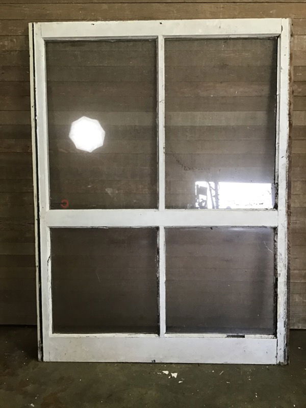 Vintage large wood frame window sash. There are 4 big divided panes, one of which opens. A great project window for garden or like outdoor creative use.