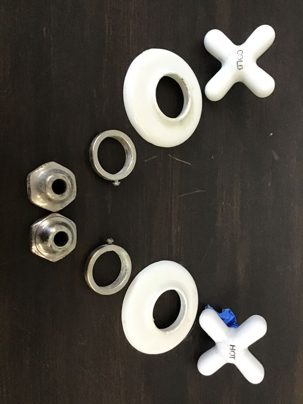 Pair of vintage nickel faucet handles with labeled porcelain handles by Karl Hutter. Porcelain is a little cracked on these ones. Price reflects.