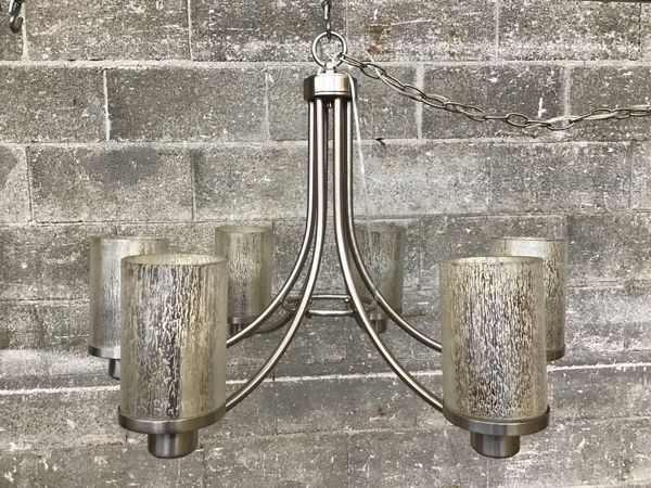 Six arm chandelier with speckled glass shades and a brushed nickel finish. Clean and ready to install, has a chain that is about four feet long.