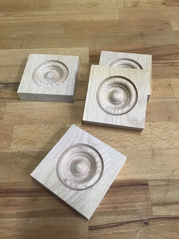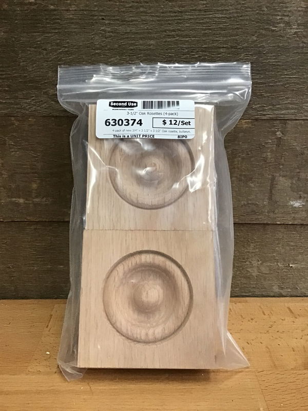 4-pack of new 3/4" x 3 1/2" x 3 1/2" Oak rosette, bullseye, plinth blocks. Fits all styles of 5/8" thick by 3 1/2" wide casing. Can be used for both windows and doors. 4-pack retails new for $28.
