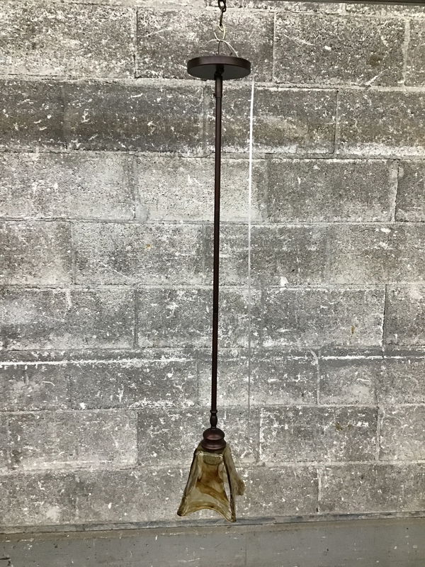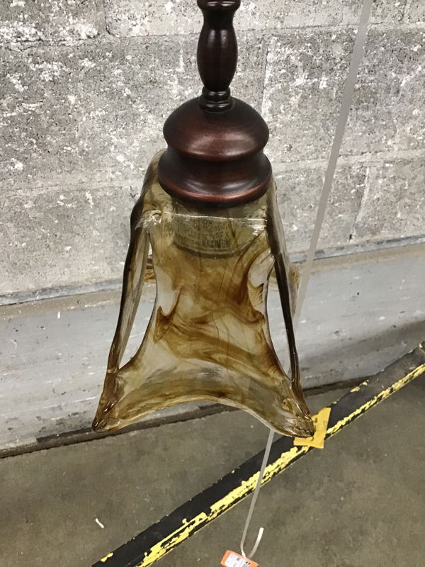 Unique looking pendant light with a hand blown glass shade that looks a lot like latté art and an antiqued bronze finish stem.