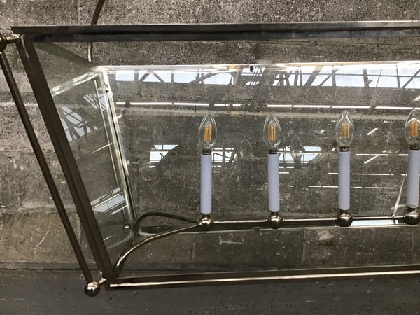 From Visual Comfort, this linear chandelier features a polished nickel finish, seven candle sleeve light sockets, four clear glass panes and brass construction. Limited wear. Photo is representative; this unit is missing some chain. Retails at $3,900+.