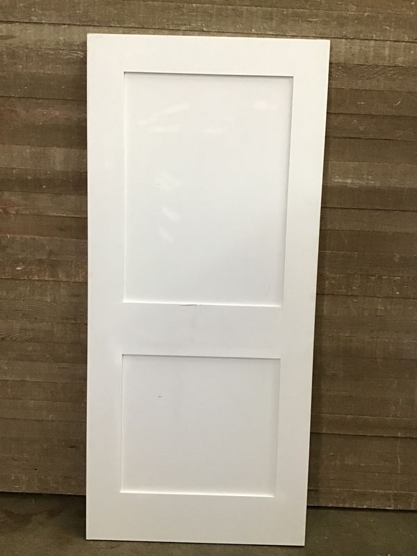 Masonite skin Shaker style two panel exterior door, not cut for hinges or latch. Unused misorder/return with minor cosmetic damage.