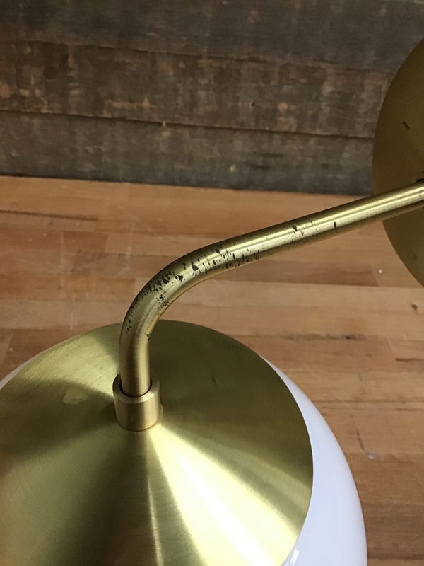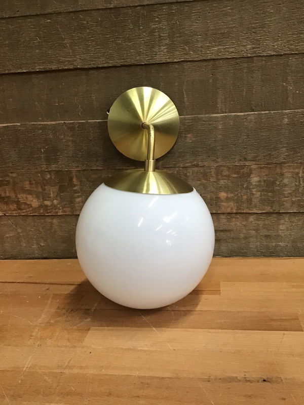 New, never installed MCM opal glass globe wall scone with brass fixture. This sconce can be positioned upwards or downwards and would be perfect for your bedside, hallway or bathroom! Sconce does have a bit of tarnishing on the arm. This sconce retails for $159 and you can find more details here:
