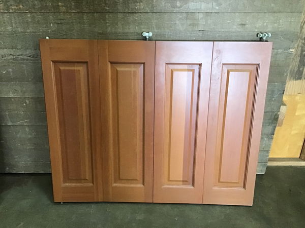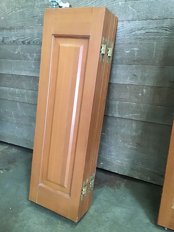 Very handsome 45" four-panel CVG Fir window covering. It has hardware that indicates it folded open and closed on a top-and-bottom track. Each panel measures 11.25" wide. This could be repurposed in a variety of ways that do not necessarily have to do with windows.