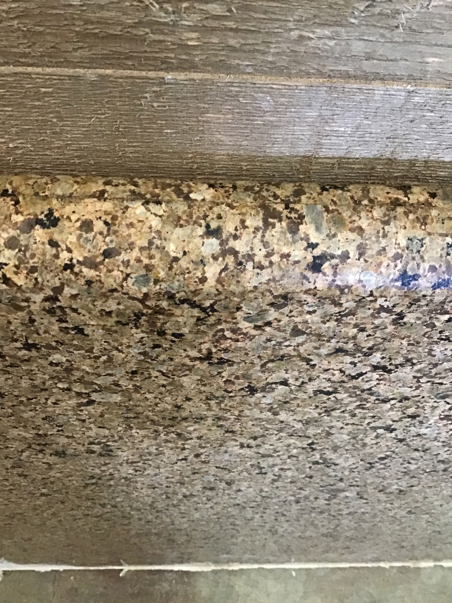 Man-made stone countertop piece featuring brown and black colors and rounded edges.