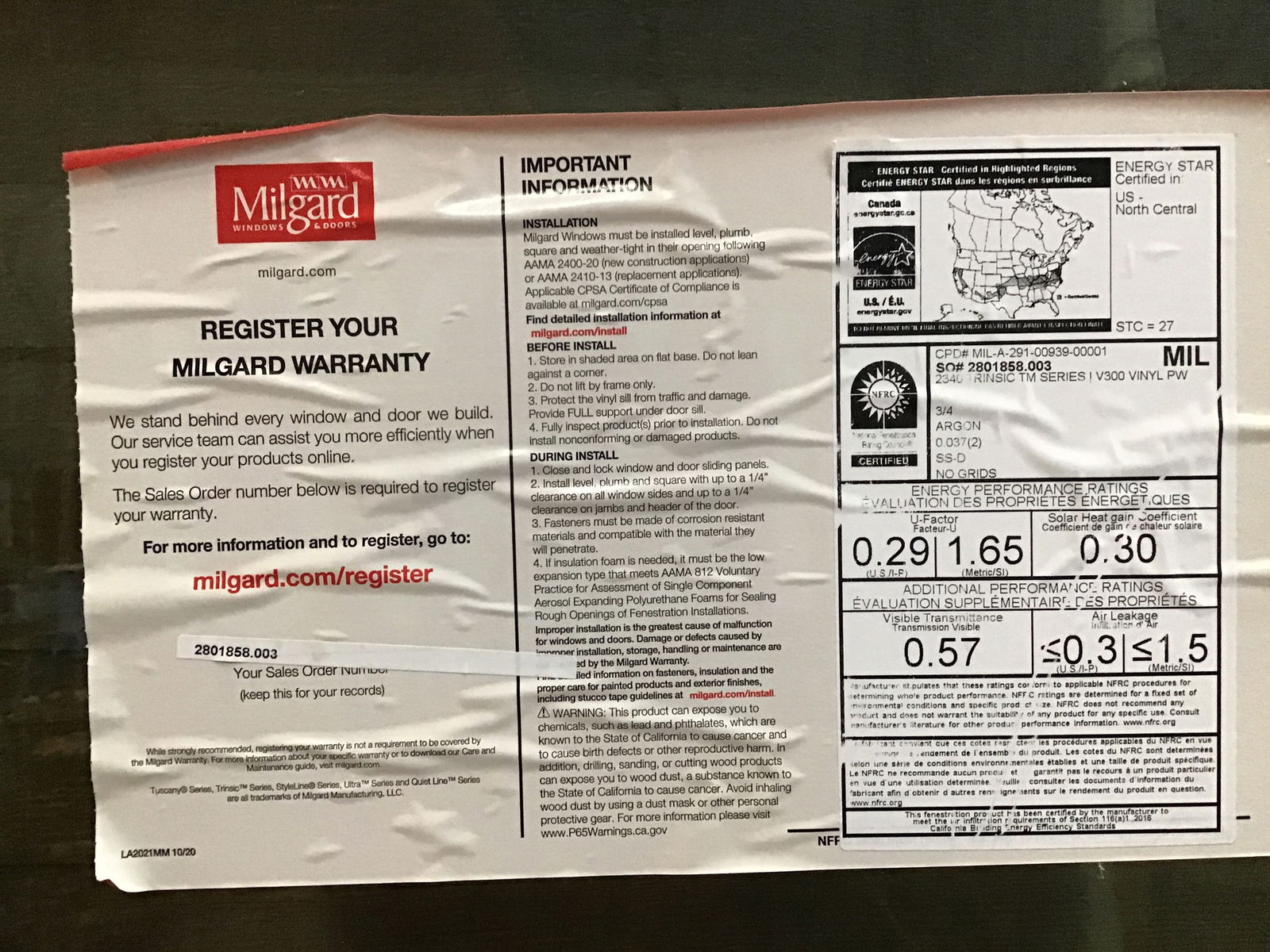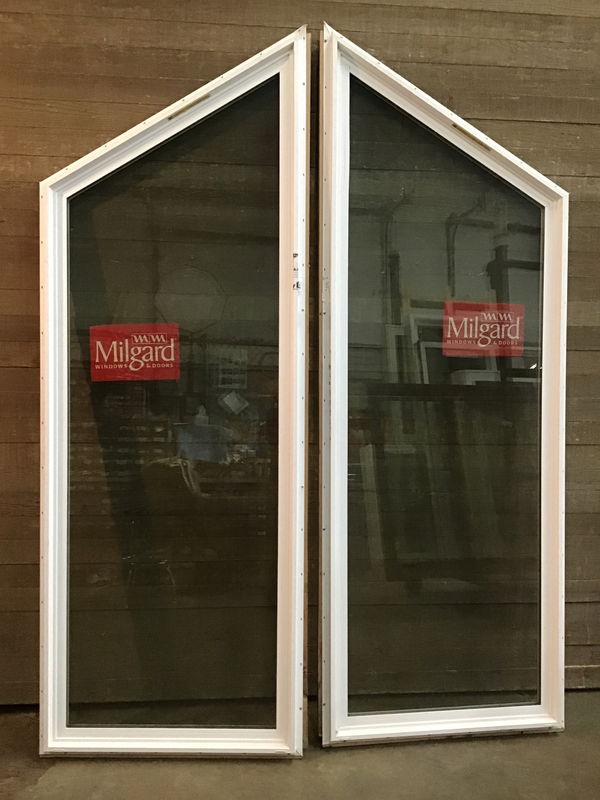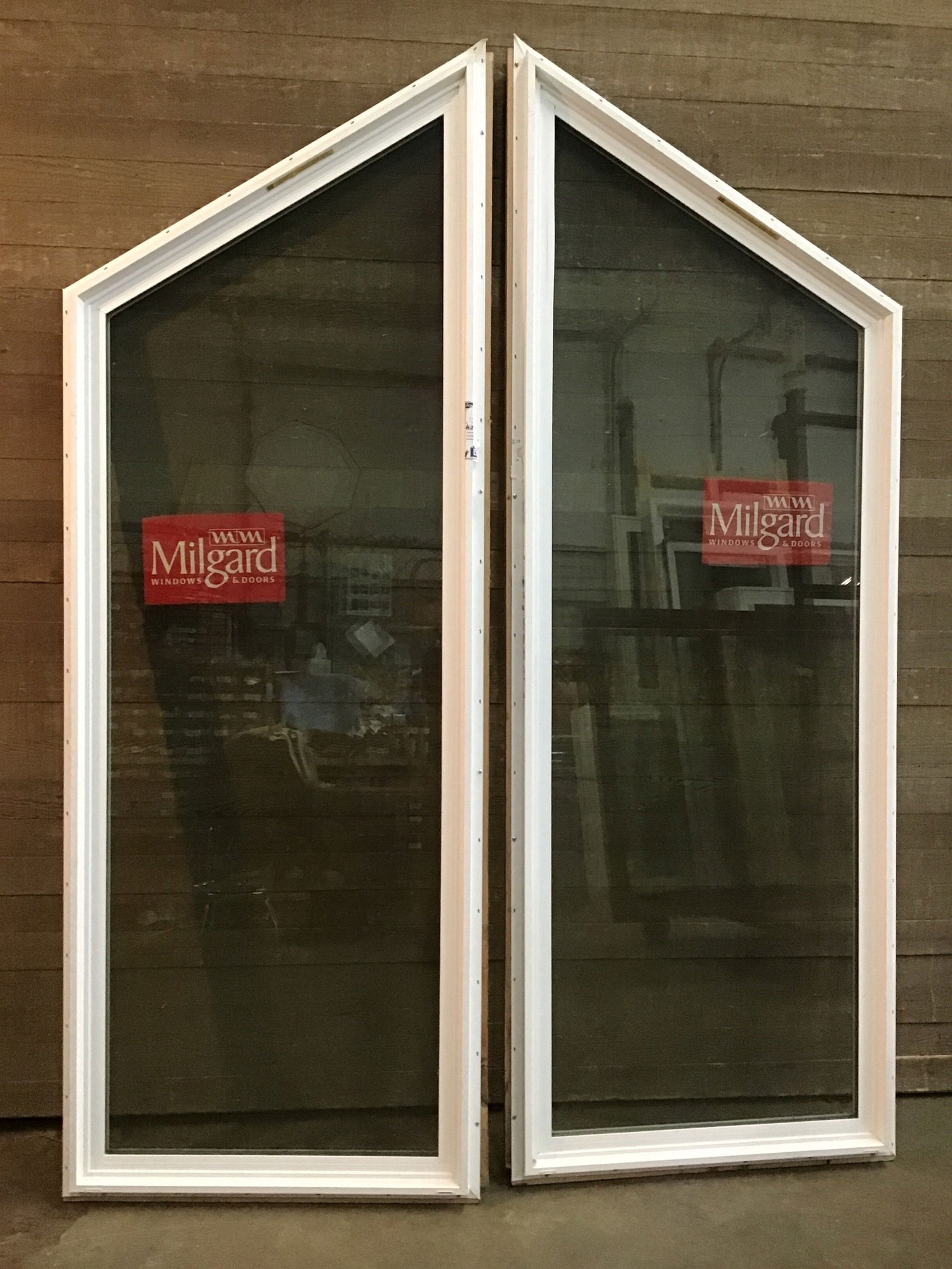 Pair of Milgard fixed trapezoid vinyl windows. Both windows have never been installed and still have their original energy tags on them. The shorter side measures 75.375" for each, the taller side measures 95.5" for each. Sold as a pair.